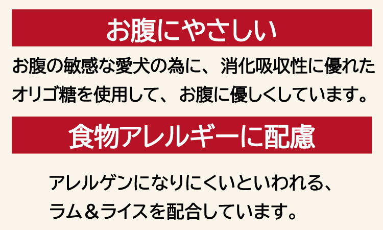 | 原材料 | 米、ラム、家禽ミール※1、コーングルテンミール、動物性油脂、家禽ダイジェスト、菜種油、ひまわり油、魚油、亜麻仁油、大豆油、、エン麦ふすま※2、ビタミン類[レチノール(A)、コレカルシフェロール(D3)、トコフェロール(E)、メナジオン(K)、チアミン(B1)、リボフラビン(B2)、ナイアシン(B3)、パントテン酸(B群)、ピリドキシン(B6)、葉酸、ビオチン(B7)、シアノコバラミン(B12)、コリン、イノシトール(B群)]、ミネラル類[鉄、銅、マンガン、亜鉛、ヨウ素、セレン]、フラクトオリゴ糖、ユッカフォーム抽出物、メタリン酸ナトリウム、酸化防止剤[ミックストコフェロール、ローズマリー抽出物、クエン酸]、増粘安定剤[レシチン]製造用剤[無水ケイ酸] (※1チキン、ターキー等) (※2小麦ではありません) |
